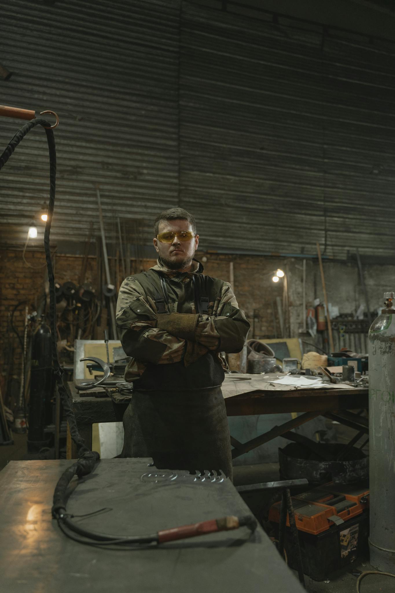 A focused welder in a workshop, working with steel and sparks flying.